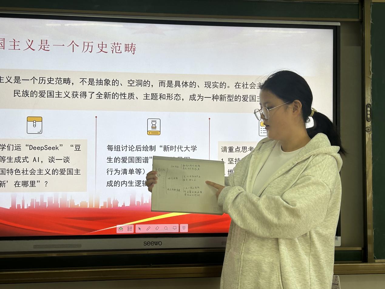 课堂现场:在明确了“为何爱国”“何为爱国”后,课程迈向最关键一步——“如何爱国”。老师引导学生运用“DeepSeek”“豆包”等生成式AI工具,自主探究“中国特色社会主义爱国主义之‘新’”。各小组随后合作绘制“新时代大学生的爱国图谱”,将抽象的担当转化为一份份具体的行为清单和思维导图,实现了知行合一的教学目标。