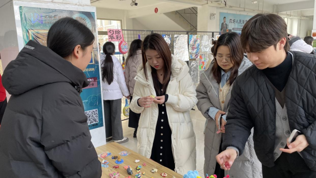 展览现场,生动的“棒韵生花”扭扭棒作品,将幼儿感统训练与美学创作巧妙结合,尽显文化育人初心;学生作品“绘本传薪”以童趣笔触拆解非遗技艺、二十四节气等传统文化元素,让经典在纸页间焕发新生;“针缝匠意”布玩偶、“精卷细作”文创作品,每一针、每一卷都凝聚着师生对细节的极致打磨,诠释着精益求精的匠心传承;“勺绘华彩”马勺、“只此靛蓝”扎染、“箔绘精工”烧箔画等非遗类作品,则在还原传统技艺质朴张力的同时融入创新设计,展现了文化旅游学院在非遗传承中注入的时代匠心精神。此外,胶板刻画“刻绘流年”、石塑粘土“泥韵匠心”、锡纸画“锡纸漫章”等作品,或描绘市井烟火,或承载吉祥寓意,或玩转现代肌理,全方位呈现了学子们“以技践学、以艺传情”的专业追求,更彰显了党建引领下青年学子的使命担当。