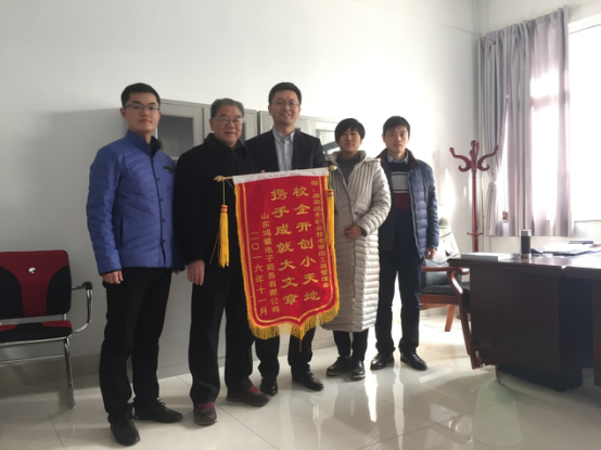 2016年12月9日,山东鸿猫电子商务有限公司张总、岳主管一行,为感谢工商系师生在“双十一千人云客服”活动中取得的骄人成绩专程送来锦旗及感谢信。