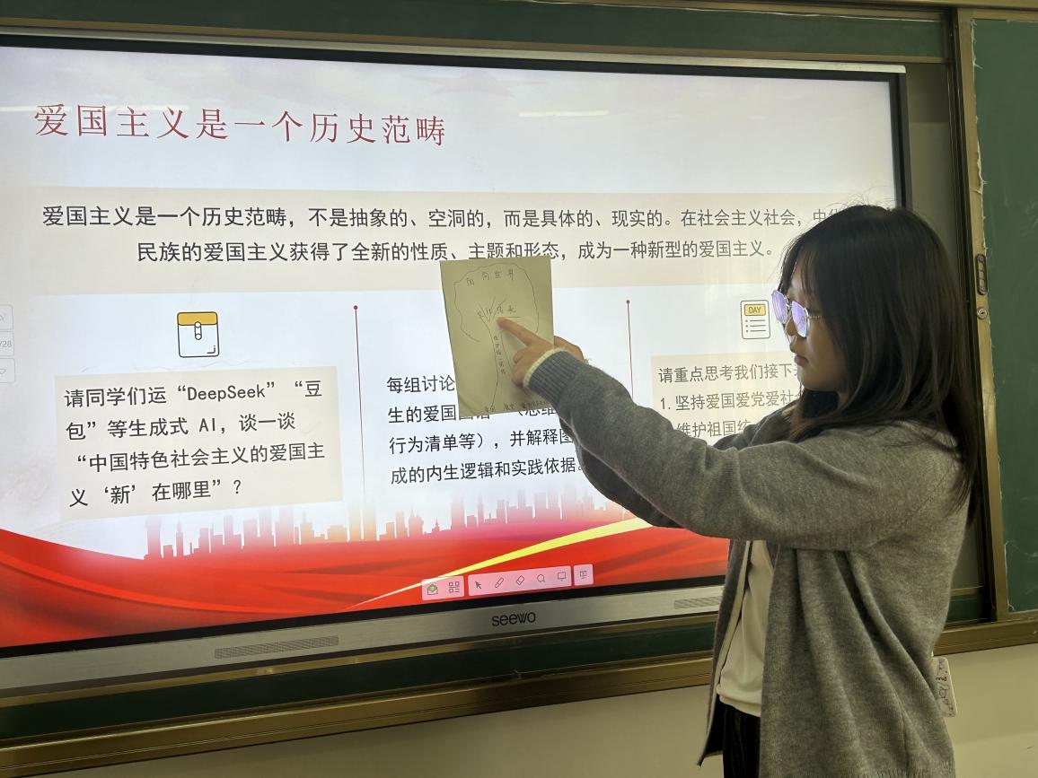 课堂现场:在明确了“为何爱国”“何为爱国”后,课程迈向最关键一步——“如何爱国”。老师引导学生运用“DeepSeek”“豆包”等生成式AI工具,自主探究“中国特色社会主义爱国主义之‘新’”。各小组随后合作绘制“新时代大学生的爱国图谱”,将抽象的担当转化为一份份具体的行为清单和思维导图,实现了知行合一的教学目标。