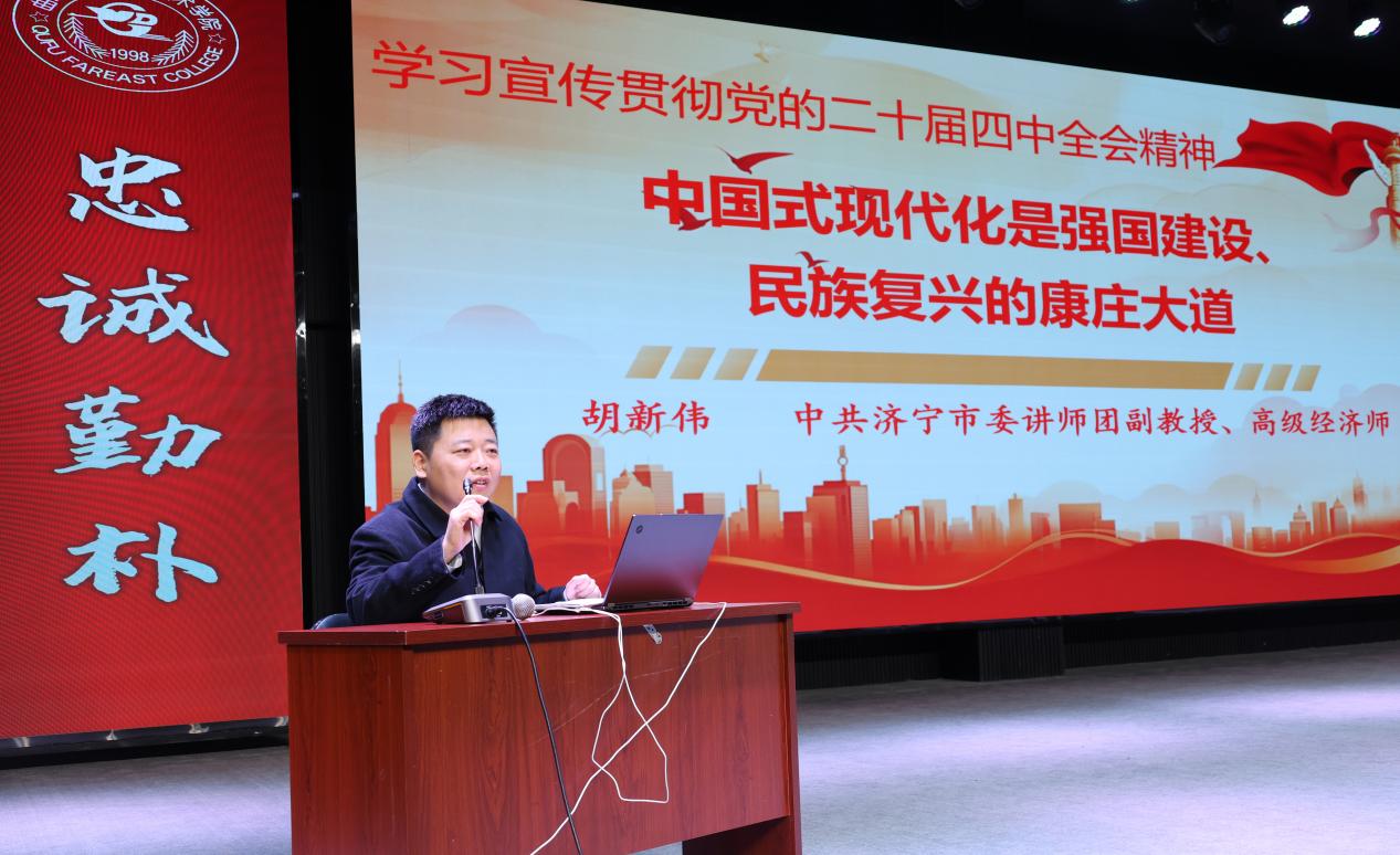 11月26日,中共济宁市委讲师团走进曲阜远东职业技术学院,在勤朴楼报告厅举办“学思想·悟道理·用方法”暨“习语润儒乡·党的创新理论‘大众话’”主题宣讲。学校领导、高铁校区中层干部、思政课专兼职教师、辅导员及在校大学生代表共同聆听这场有深度、有温度的思想盛宴。宣讲活动由学校党委副书记王万民主持。